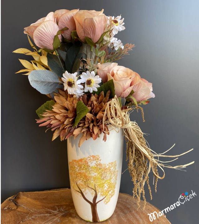 Cam vazo içerisinde sonbahar renklerinde gerçek gibi görünen yapay çiçeklerle hazırlanan özgün aranjman modelimiz. Krem rengi yapay çiçeklerin arasında kuru başaklar, haşhaşlar ve kuru dallarla renklendirilen aranjman modelimizi uzun yıllar dekoratif olarak salonunuzda sergileyebilirsiniz. Özel günler için sevdiklerinize kalıcı yapay aranjman hediye etmek isterseniz, tek tıkla siparişlerinizi iletebilirsiniz. Yapay aranjman siparişlerinizi İstanbul dışına da kargo ile 1-3 iş günü içerisinde elinizde olacak şekilde ulaştırıyoruz.